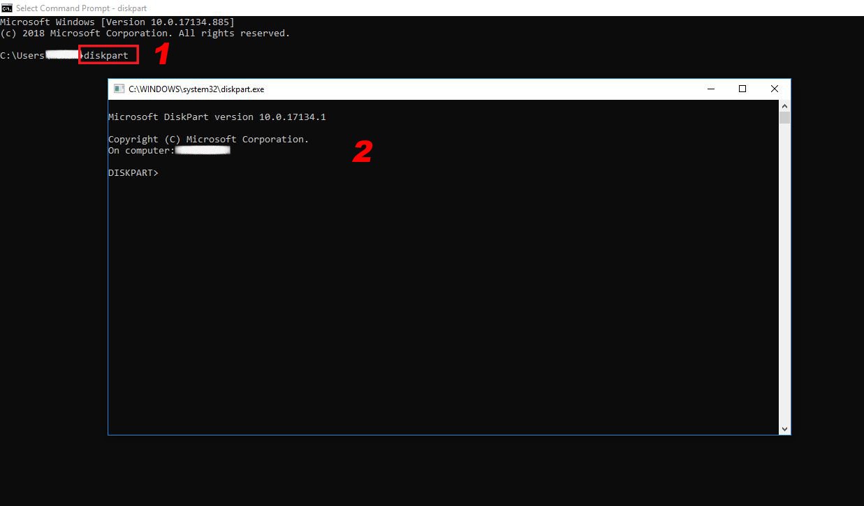 As you opened your Command Prompt, you will need to type “diskpart”. Run the command and a warning will appear. Accept the terms and continue to next step. Accepting the terms will open a new tab.